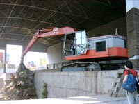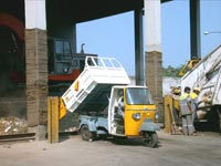 TRANSFER STATIONS make sense only if processing and disposal sites are over 20 km away, making travel time for small vehicles unviable. Ground-level transfer stations, like that designed by Onyx in a Chennai (Madras) fleet workshop, are most cost- and space-saving. Small tipper autos etc unload waste into a trough from which a rotating grab crane on rails lifts it into large 20-tonner vehicles waiting on a parallel track. Such an option allows for easy change of location of the transfer station if needed. Other elevated Transfer Stations provide for the small Primary-Transport vehicles to drive up a long ramp with and drop their load through a chute into the top of a large Secondary-Collection truck. This is often messy, and requires huge space and expense to construct a long ramp with gradual slope for small loaded vehicles to drive up easily.